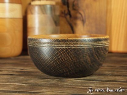 Diamètre: 14cm environ, hauteur: 7,5cm environ. Très beau chêne, l’extérieur a été coloré en faisant réagir les tanins du bois avec de la « soupe de clous » (du fer plongé dans du vinaigre, il s’agit de l’antique procédé pour imiter l’ébène). Sur le chêne ça donne une couleur bleu nuit, qui a tendance à foncer une fois huilée