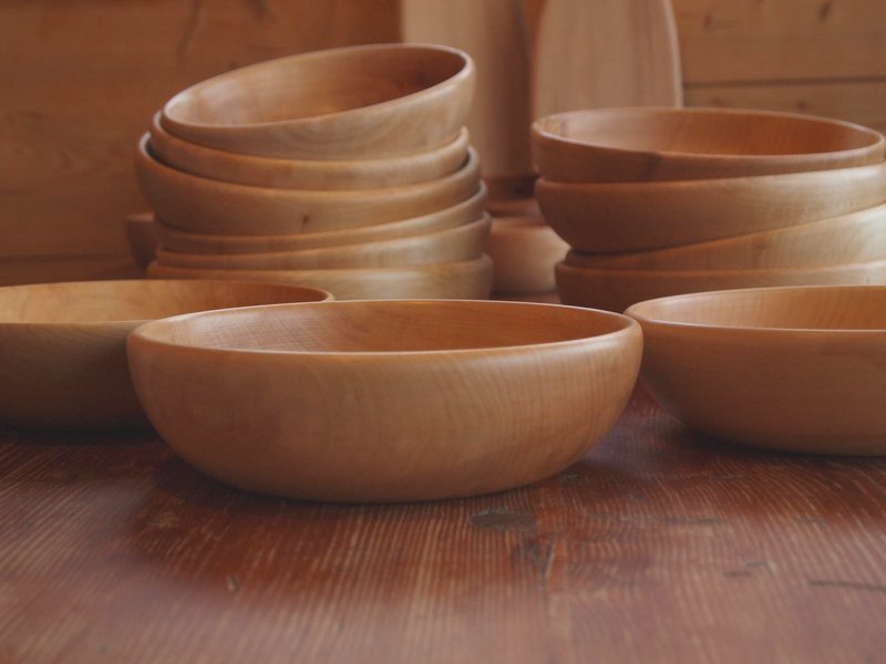 Ces écuelles en bois, tournées artisanalement dans mon atelier des Alpes, sont semblables, mais pas rigoureusement identiques: il peut y avoir de légères variations de tailles, de formes. Toutefois, la différence ne saute pas aux yeux sur une table! Le dessin du bois donne à chaque pièce un caractère unique.