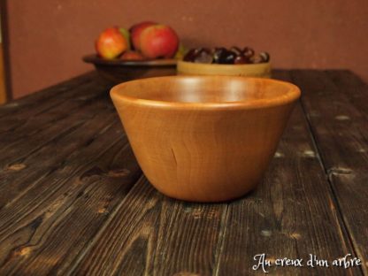 Chaque pièce est unique, réalisée manuellement dans mon atelier, en bois massif, sans aucun collage. La matière première est locale (Savoie et départements limitrophes). Les bois sélectionnés sont secs, adaptés à l'usage alimentaire.