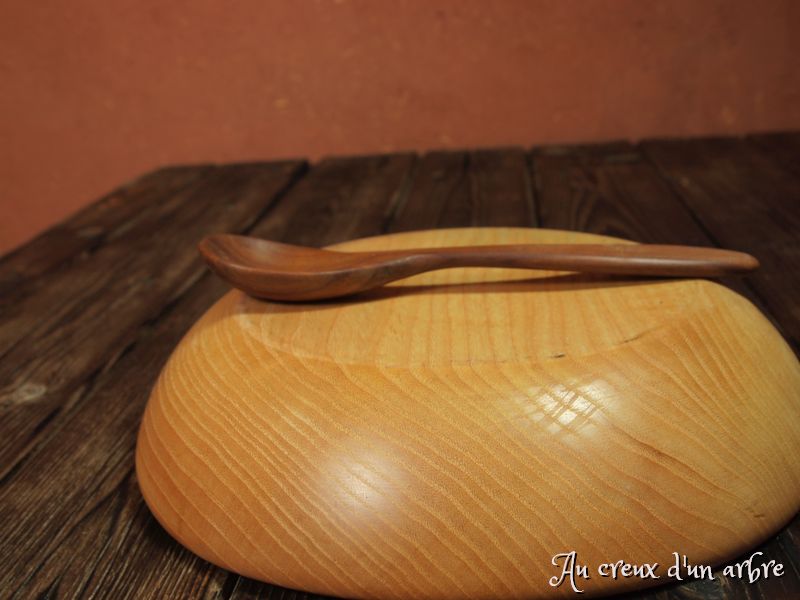 Cette cuillère en bois est réalisée en merisier. J’aime bien sa teinte chaude pour mes repas, et ça me change de mes éternelles cuillères “de cantine” en inox.