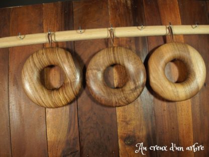 Diamètre: 15cm environ, hauteur: 3cm environ. Finition : huile dure écologique. Avec un cordon en cuir pour suspendre le dessous de plat